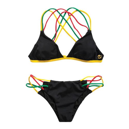 Youll be looking laid back and lovely in the irie style of the Billabong Juniors' Lorana Triangle Two Piece Bikini. Sporting the colors of the Rastafari Nation, this 2 piece swimsuit has a traditional triangle top and boy bottoms detailed with multi colored strings for extra style. Youll be looking ready for some chill time on the beach when youre wearing the Billabong Lorana Triangle Two Piece Bikini for juniors.