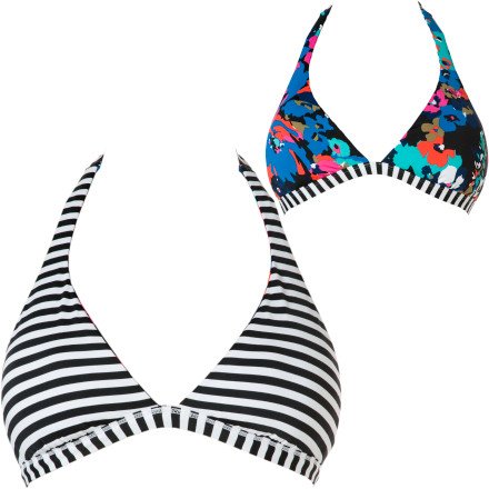 The Roxy Wild At Heart 70's Halter Reversible Bikini Top lets you choose between stripes and a vintage forget-me-not print so you get two looks in one top.